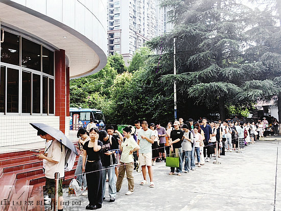 8月8日早上,在綿陽市圖書館院內(nèi),兩列隊(duì)伍從一樓大廳階梯處,蜿蜒排至大門入口。