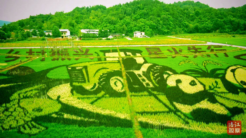放眼望去,一望無垠的田野上既有“李白月下飲酒”“推廣農(nóng)業(yè)機(jī)械”“國寶熊貓”等彩色圖案,又有“李白故里、詩城江油”“鄉(xiāng)村振興、星火先行”等文字。