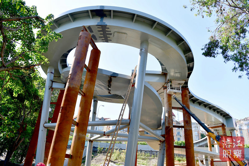 記者在沈家壩富樂小學(xué)人行天橋施工現(xiàn)場(chǎng)看到,這座天橋主體鋼結(jié)構(gòu)已架設(shè)完成。
