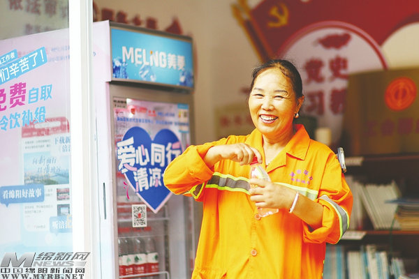 在游仙區(qū)審計(jì)局外,路過(guò)的外賣小哥黃斌看到了“涪寶愛(ài)心冰柜”,得知可以免費(fèi)取用后,他拿出一瓶冰水大口喝了起來(lái)。