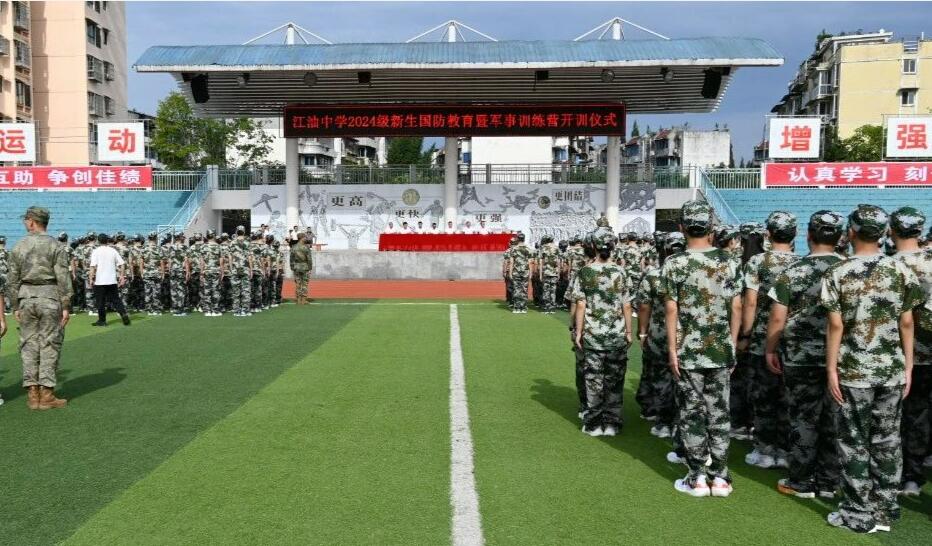 為主題的2024級新生國防教育暨軍事訓(xùn)練營開營儀式。江油市人民武裝部領(lǐng)導(dǎo)、學(xué)校黨委班子全體成員、學(xué)校相關(guān)行政干部及2024級全體師生參加了開營儀式。開營儀式由黨委委員、副校長陳海龍主持。