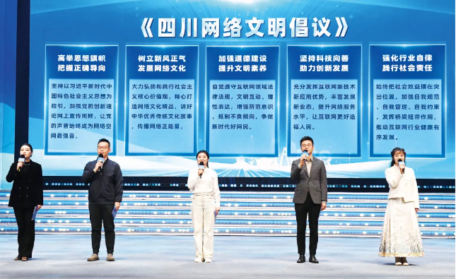 2023年12月28日,在四川省網(wǎng)絡(luò)文明建設(shè)暨走好網(wǎng)上群眾路線活動(dòng)中,5名代表共同宣讀《四川網(wǎng)絡(luò)文明倡議》。圖/四川省委網(wǎng)信辦