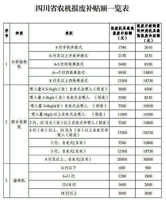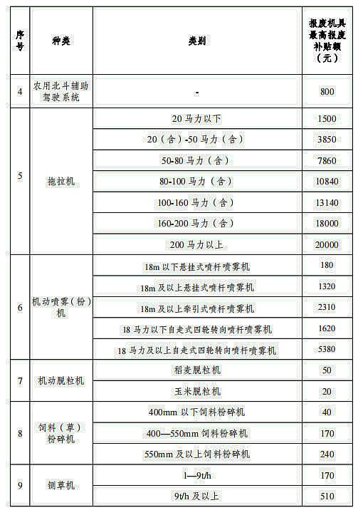 報廢部分實行定額補貼。其中:拖拉機、三大糧食作物聯(lián)合收割機、播種機和農(nóng)用北斗輔助駕駛系統(tǒng)報廢按照農(nóng)業(yè)農(nóng)村部、財政部發(fā)布的最高補貼額予以補貼。農(nóng)用北斗輔助駕駛系統(tǒng)報廢補貼申領(lǐng)要以購置新設(shè)備為前提,按照800元予以補貼。其他農(nóng)機報廢,按照同類型農(nóng)機購置與應(yīng)用補貼額30%測算,并綜合考慮運輸拆解成本等因素確定,單臺農(nóng)機報廢補貼額不超過2萬元。報廢聯(lián)合收割機、播種機、水稻插秧機并新購置同種類機具,在上述補貼標準基礎(chǔ)上,按照50%的比例提高報廢補貼標準,單臺最高報廢補貼額不超過3萬元。