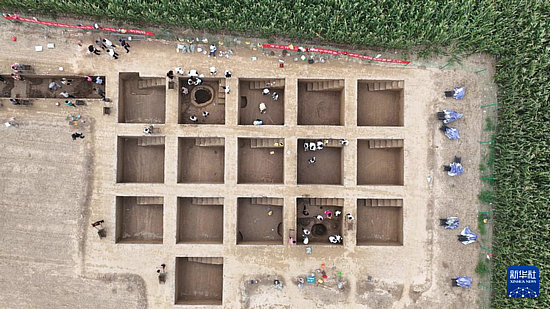 考古隊(duì)員在柏人城遺址第五次考古發(fā)掘現(xiàn)場(chǎng)作業(yè)(9月5日攝,無人機(jī)照片)。
