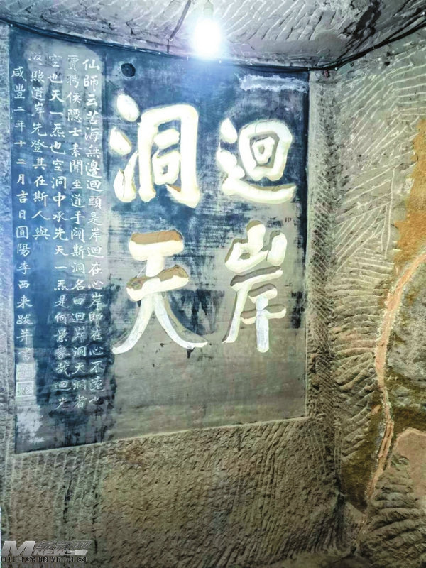 尋樂書巖的書法精品匯聚在第三層石室“回岸洞天”,這里四壁皆是書法作品,琳瑯滿目,字體疏異,猶如一座書法展廳。對窗石壁上書刻“回岸洞天”四個陰文大字,是曾教過道光皇帝的四川名儒李嘉秀所題,寫得氣勢恢宏,鑿得精美細膩,半圓柱的陰刻筆道中能塞進一個拳頭,表達出苦海無邊、回頭是岸的釋家思想。