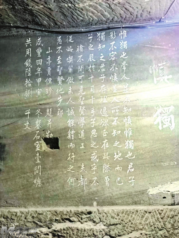 進入第二層,只見東壁上刻“主敬”“慎獨”四個紅色大字。“主敬”來自程朱理學,程頤、朱熹都講主敬,強調(diào)居敬、持敬,認為這是萬善之本,是為學的綱領。“慎獨”兩個大字旁邊有十行行書題跋以釋其義,共140字,這是賈儒珍當年親筆所刻。“慎獨”出自《大學》:“此謂誠於中,形於外,故君子必慎其獨也。”告誡人們在獨處之時要格外注重個人的道德品質(zhì)修養(yǎng),不能只做表面功夫給他人看。“主敬”“慎獨”等大字昭示著洞窟主人高尚的人格追求,也激勵警醒著參觀者。