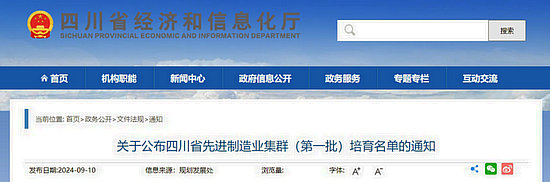 據(jù)四川省經(jīng)濟和信息化廳網(wǎng)站消息,9月10日,四川省經(jīng)濟和信息化廳公布了四川省先進制造業(yè)集群(第一批)培育名單,17個集群入選。
