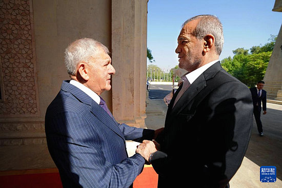 9月11日,伊拉克總統(tǒng)拉希德(右)在首都巴格達(dá)同到訪的伊朗總統(tǒng)佩澤希齊揚(yáng)舉行會(huì)談。新華社發(fā)