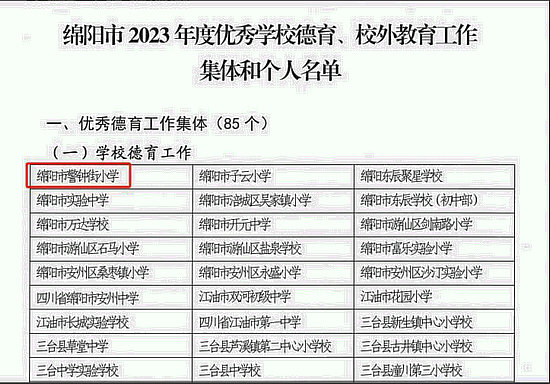 綿陽新聞網(wǎng)訊 近日,按照綿陽市教育和體育局關(guān)于評選綿陽市2023年度優(yōu)秀學(xué)校德育工作集體的工作安排,綿陽市警鐘街小學(xué)脫穎而出,榮獲綿陽市2023年度優(yōu)秀德育工作集體榮譽稱號。