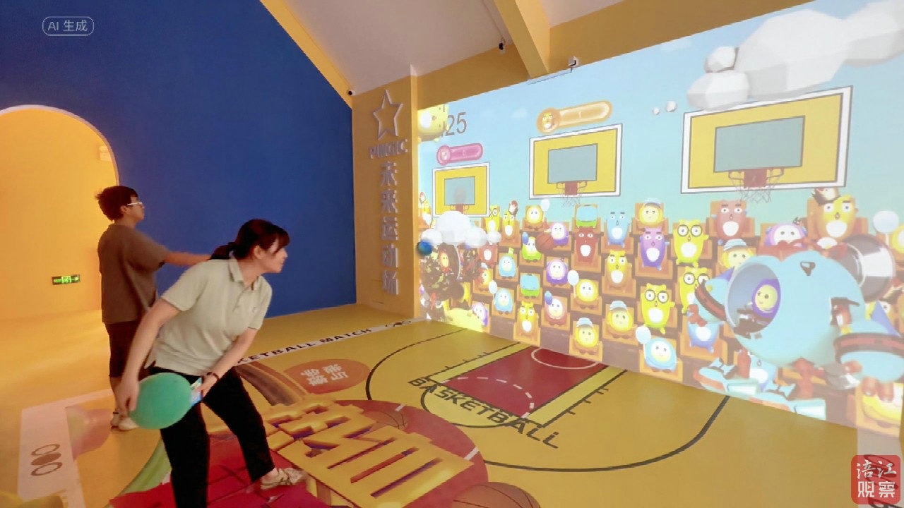 在“未來運動場”內(nèi),游客可以拿起籃球,親身體驗一場虛擬投籃比賽: