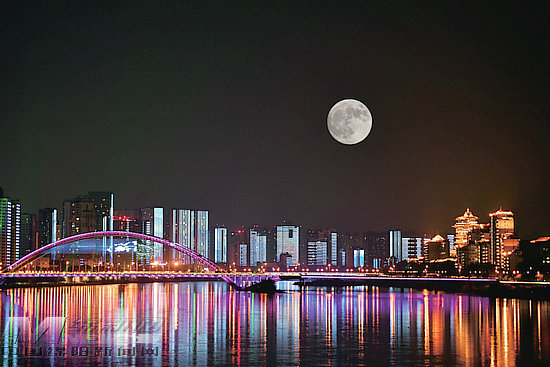 9月17日晚,一輪明月緩緩升起,宛如一個白玉盤,月光灑在三江兩岸,與絢麗的燈光,組成了一幅溫情畫卷(兩次曝光合成)。(記者 王勇 攝)
