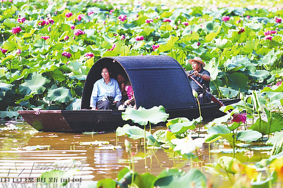 游客乘船觀賞荷花