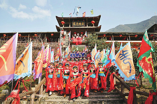 游客走出車門的一刻,鑼鼓、嗩吶和羌族民歌潮水般涌來。寬闊的青石階梯天梯般直達由杉皮和松木桿搭建的寨門。階梯兩邊,身穿羌袍的羌族男女以最熱烈的大紅、桃紅和湖藍肆無忌憚地展示著自己大雅大俗之美。路行一半,熱情的主人已經迎上來,獻羌紅,敬咂酒。