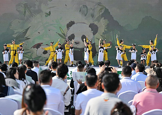 9月22日,小朋友們?cè)趩?dòng)發(fā)布會(huì)上表演童聲合唱《熊貓》。新華社記者 劉坤 攝