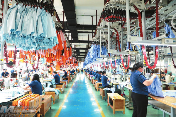 在大多數(shù)人印象中,服裝紡織行業(yè)屬于傳統(tǒng)工業(yè)中的勞動(dòng)密集型產(chǎn)業(yè)。然而,記者在現(xiàn)場看到,第四車間已經(jīng)引入了一條自動(dòng)智能吊掛生產(chǎn)線,上一個(gè)環(huán)節(jié)的工人只需把半成品掛到吊掛機(jī)上,就自動(dòng)運(yùn)輸?shù)较乱粋€(gè)工序進(jìn)行下一步的生產(chǎn)。