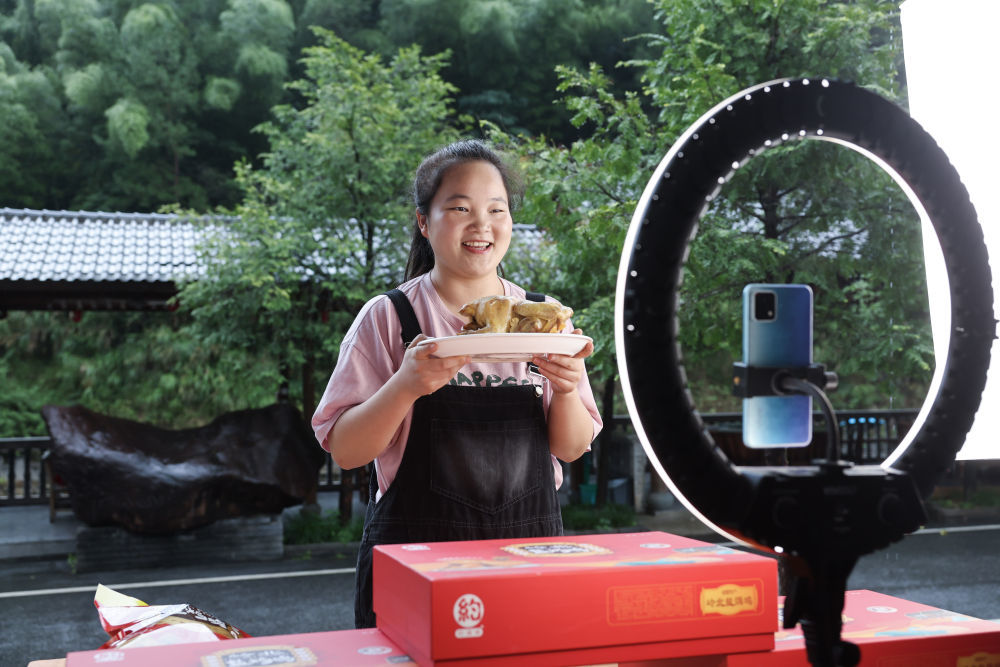 2024年9月19日,浙江省諸暨市嶺北鎮(zhèn)一位主播在直播銷售嶺北鹽焗雞。 新華社記者 徐昱 攝