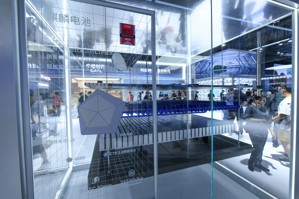 在第二十七屆成都國際車展上,企業(yè)展示新能源汽車動(dòng)力電池。新華社記者唐文豪 攝