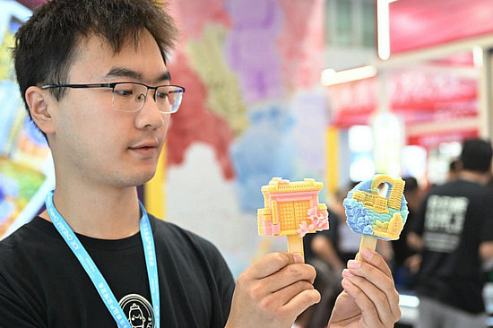 9月26日,參展商在博覽會現(xiàn)場展示兩款高校主題文創(chuàng)冰淇淋。新華社記者 孫凡越 攝
