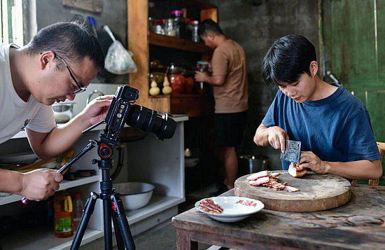 9月26日,在陳家寨村,“念鄉(xiāng)人周周團隊”在村里拍攝宣傳臘肉的短視頻。