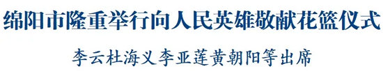 黃朝陽主持敬獻(xiàn)花籃儀式。市委、市人大常委會、市政府、市政協(xié)領(lǐng)導(dǎo),科技城黨工委有關(guān)領(lǐng)導(dǎo),市中級法院院長、市檢察院檢察長,駐綿部隊有關(guān)領(lǐng)導(dǎo),市直部門、民主黨派、工商聯(lián)、無黨派人士及科學(xué)城辦事處代表,烈士遺屬、志愿軍老戰(zhàn)士、老同志和退役軍人代表,師生代表、企業(yè)職工代表、消防員代表和駐綿部隊官兵代表,涪城區(qū)黨、政、軍和人民團(tuán)體負(fù)責(zé)人及各界群眾代表等參加。