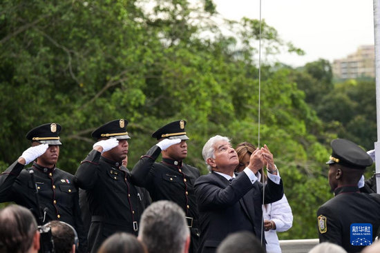 12月31日,巴拿馬總統(tǒng)穆利諾(中)在首都巴拿馬城舉行的正式收回巴拿馬運(yùn)河主權(quán)25周年紀(jì)念活動(dòng)上升起國(guó)旗。新華社記者 陳昊佺 攝