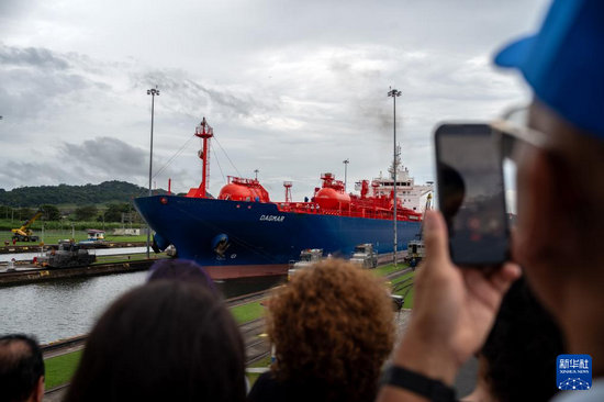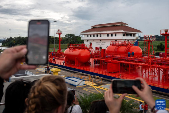 12月31日,在巴拿馬首都巴拿馬城附近,游客在巴拿馬運(yùn)河的米拉弗洛雷斯船閘游客中心觀看輪船通過(guò)船閘駛?cè)胩窖?。新華社記者 李木子 攝