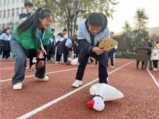 活動中,有的同學(xué)步伐靈活,巧妙用腳控制著“鴨子”的行進方向;有的同學(xué)與隊友默契配合,通過快速的傳遞和接應(yīng),讓“鴨子”在隊伍間有序穿梭;有的同學(xué)在加油助威聲中奮起直追,展現(xiàn)出堅韌不拔的毅力和團結(jié)協(xié)作的精神。同學(xué)們齊聲吶喊,整個操場充滿了歡聲笑語,吶喊聲、歡笑聲交織在一起,奏響了一曲青春的樂章。