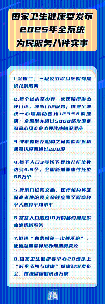 新華社北京12月31日電(記者董瑞豐、李恒)國家衛(wèi)生健康委31日發(fā)布2025年全系統(tǒng)為民服務八件實事,包括: