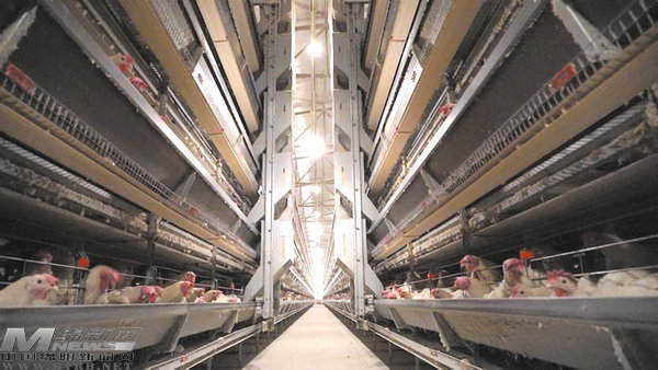 雞舍里,一排排標(biāo)準(zhǔn)化層疊式蛋雞籠整齊排列著,隨著全自動(dòng)化飼養(yǎng)系統(tǒng)啟動(dòng),飼料均勻地撒在食槽內(nèi),成千上萬(wàn)只蛋雞競(jìng)相啄食,不時(shí)有雞蛋滾進(jìn)食槽下方的收蛋槽內(nèi)。