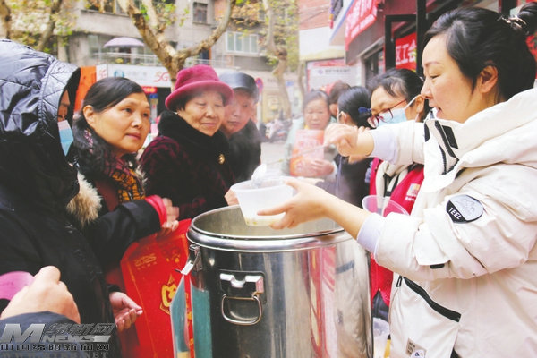解放街社區(qū)工作人員把熱氣騰騰的臘八粥送到居民手中