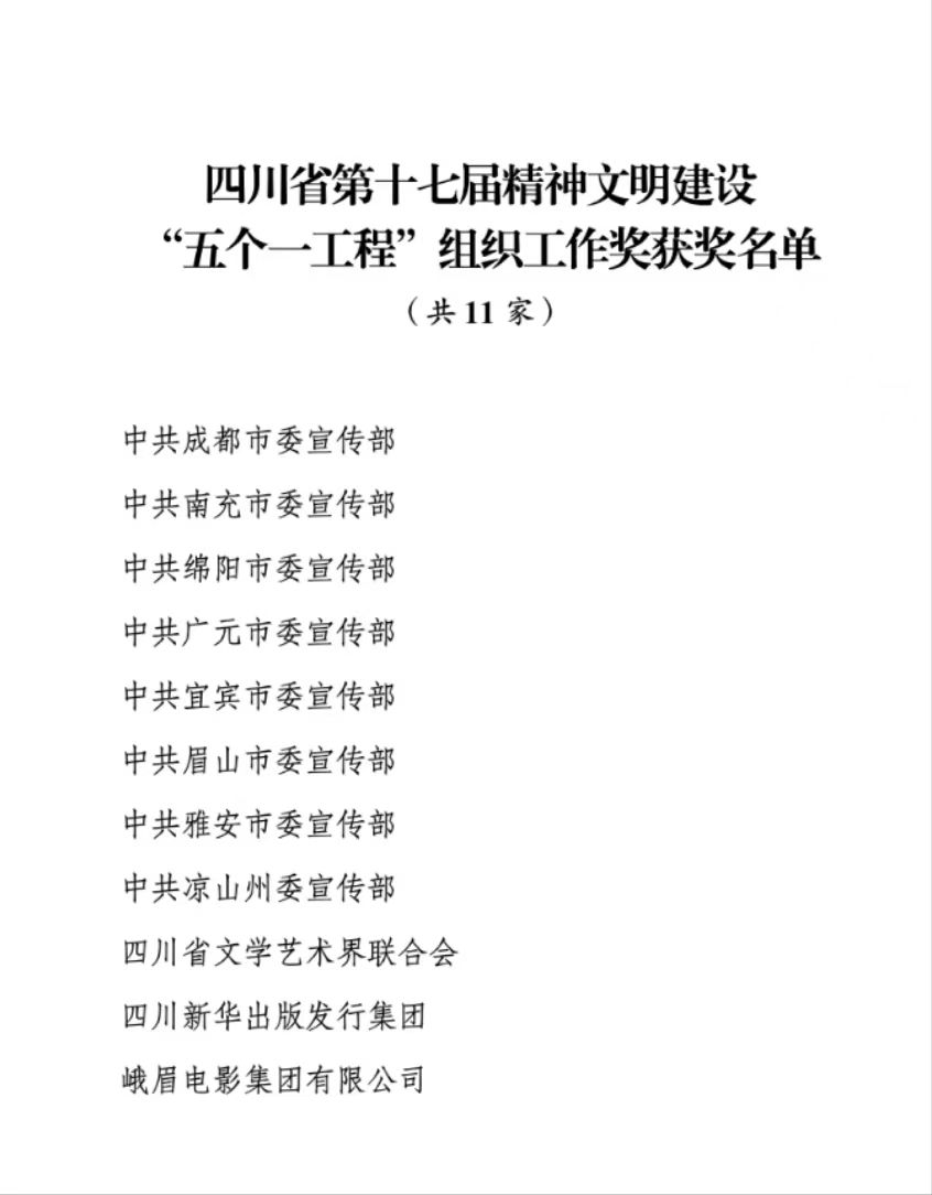 1月7日,中共四川省委宣傳部發(fā)布“關(guān)于表彰四川省第十七屆精神文明建設(shè)‘五個一工程’組織工作先進單位和優(yōu)秀作品的決定”。