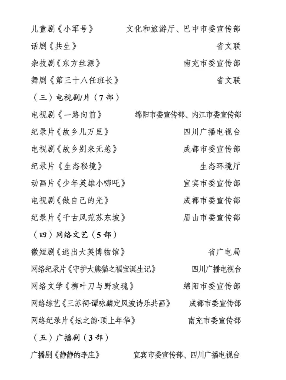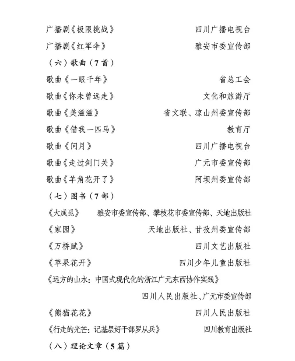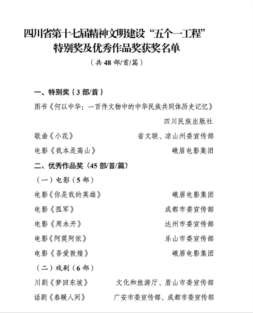 本次評選充分反映了全省精神文化產(chǎn)品創(chuàng)作的豐碩成果。成都市委宣傳部、南充市委宣傳部、省文聯(lián)、四川新華出版發(fā)行集團、峨眉電影集團等11家單位獲四川省第十七屆精神文明建設(shè)“五個一工程”組織工作獎。圖書《何以中華:一百件文物中的中華民族共同體歷史記憶》、歌曲《小花》、電影《我本是高山》3部(首)作品獲四川省第十七屆精神文明建設(shè)“五個一工程”特別獎。此外,《你是我的英雄》等5部電影作品、川劇《夢回東坡》等6部戲劇作品、《一路向前》等7部電視劇/片作品、微短劇《逃出大英博物館》等5部網(wǎng)絡(luò)文藝作品、《靜靜的李莊》等3部廣播劇作品、《一眼千年》等7首歌曲作品、《大成昆》等7部圖書、《三星堆考古與中國古史傳承體系》等5篇理論文章獲四川省第十七屆精神文明建設(shè)“五個一工程”優(yōu)秀作品獎。