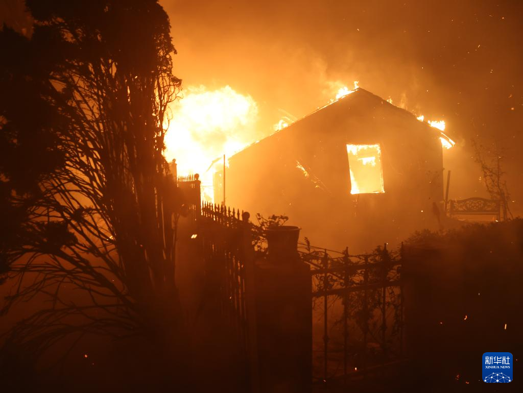 1月7日,在美國加利福尼亞州南部洛杉磯縣沿海社區(qū)帕西菲克帕利塞茲,野火吞噬房屋。新華社發(fā)(邱晨攝)