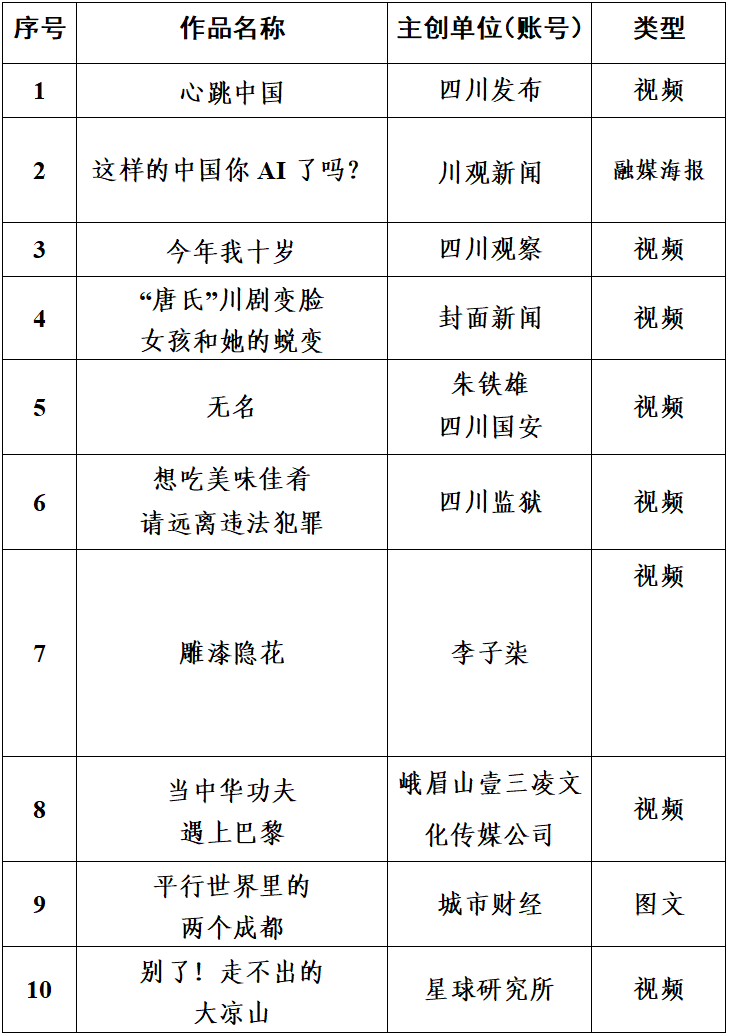 四川發(fā)布客戶端消息 日前,2024年四川省十佳“正能量澎湃大流量”網(wǎng)絡(luò)傳播精品新鮮出爐?!缎奶袊?guó)》《雕漆隱花》等10個(gè)作品入選名單。