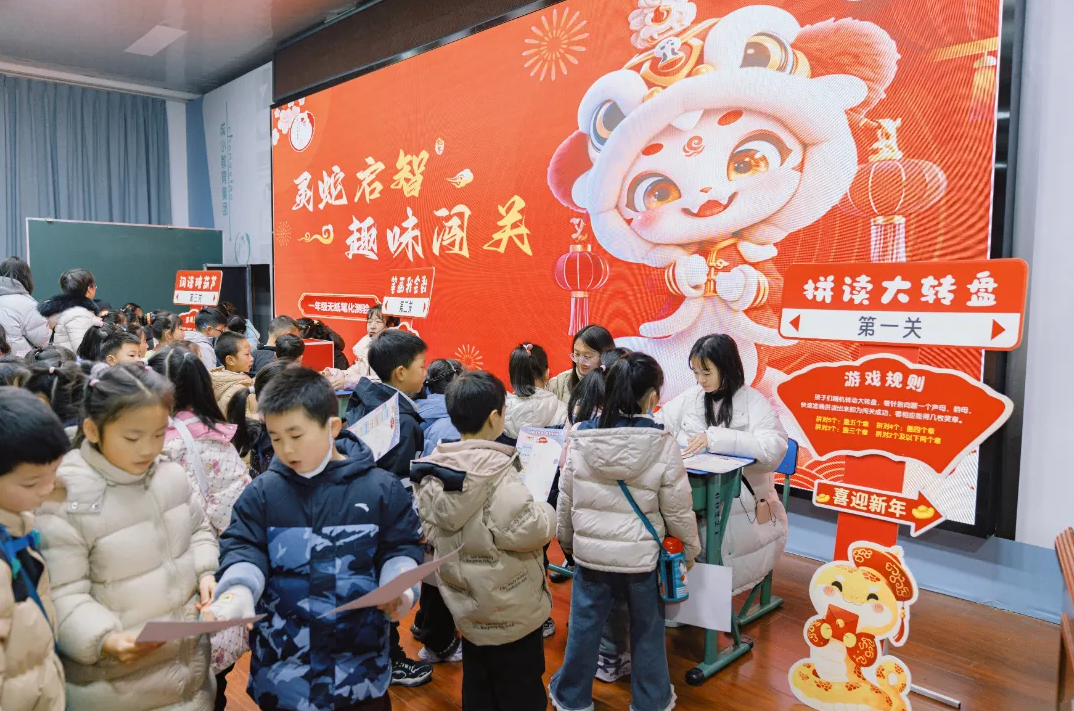 語文主場上,整齊排列在“拼讀大轉盤”處的孩子們揮舞著小手,靈活地轉動著大轉盤,看著指針指向的地方快速熟練地拼讀出聲母和韻母;“筆畫我會數(shù)”這一關,大家滿懷期待地從盲盒中抽取字卡,接著大膽自信地數(shù)出生字筆畫;“詞語糖葫蘆”給孩子們準備了精美的“糖葫蘆詞語串”,闖關的“勇士”們隨機抽取一串糖葫蘆,準確地認讀葫蘆上的詞語,闖關成功后的印章可比糖葫蘆還要甜蜜;另一關,孩子們化身神奇的小小魔法師,親自開啟“魔法書”,聲情并茂地背誦書中的兒歌課文咒語。幾個關卡有效檢驗了學生對本學期語文知識的掌握程度。