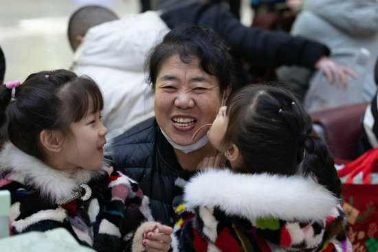 1月14日,在哈爾濱火車站候車大廳,小朋友和姥姥一起吃東西。她們從黑龍江省牡丹江市去往海南省??谑羞^年。新華社記者 張濤 攝