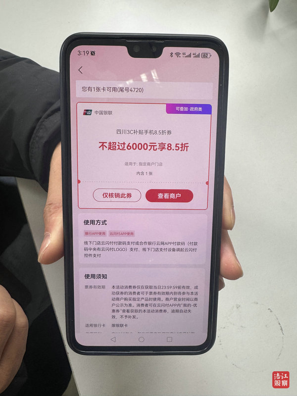 在位于涪城區(qū)金柱園的中國電信營業(yè)廳,店內(nèi)的顧客絡(luò)繹不絕。“買手機(jī),如何享受國補(bǔ)呢?”“直接在云閃付上領(lǐng)取3C數(shù)碼產(chǎn)品補(bǔ)貼就行。”市民宋先生正在咨詢補(bǔ)貼政策,他介紹,在網(wǎng)上了解到手機(jī)消費(fèi)補(bǔ)貼上線的消息,今天特意來購買。