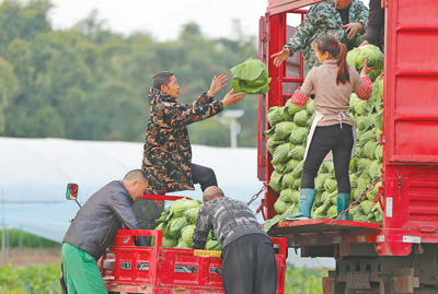 圖為1月20日,四川樂山湯家壩村,村民在裝運(yùn)蔬菜。當(dāng)?shù)貎?yōu)化種植結(jié)構(gòu),引導(dǎo)農(nóng)民種植蓮花白等特色作物,增加收入。李華時(shí)攝(人民視覺)