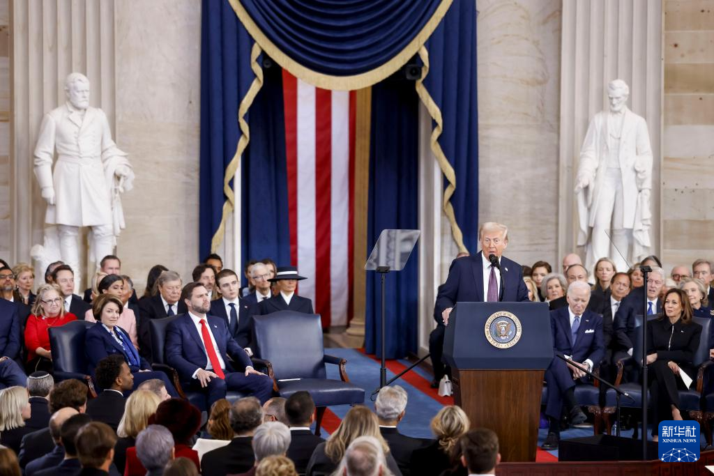 1月20日,在美國首都華盛頓國會大廈圓形大廳,特朗普在美國第47任總統(tǒng)就職典禮上發(fā)表講話。新華社/美聯