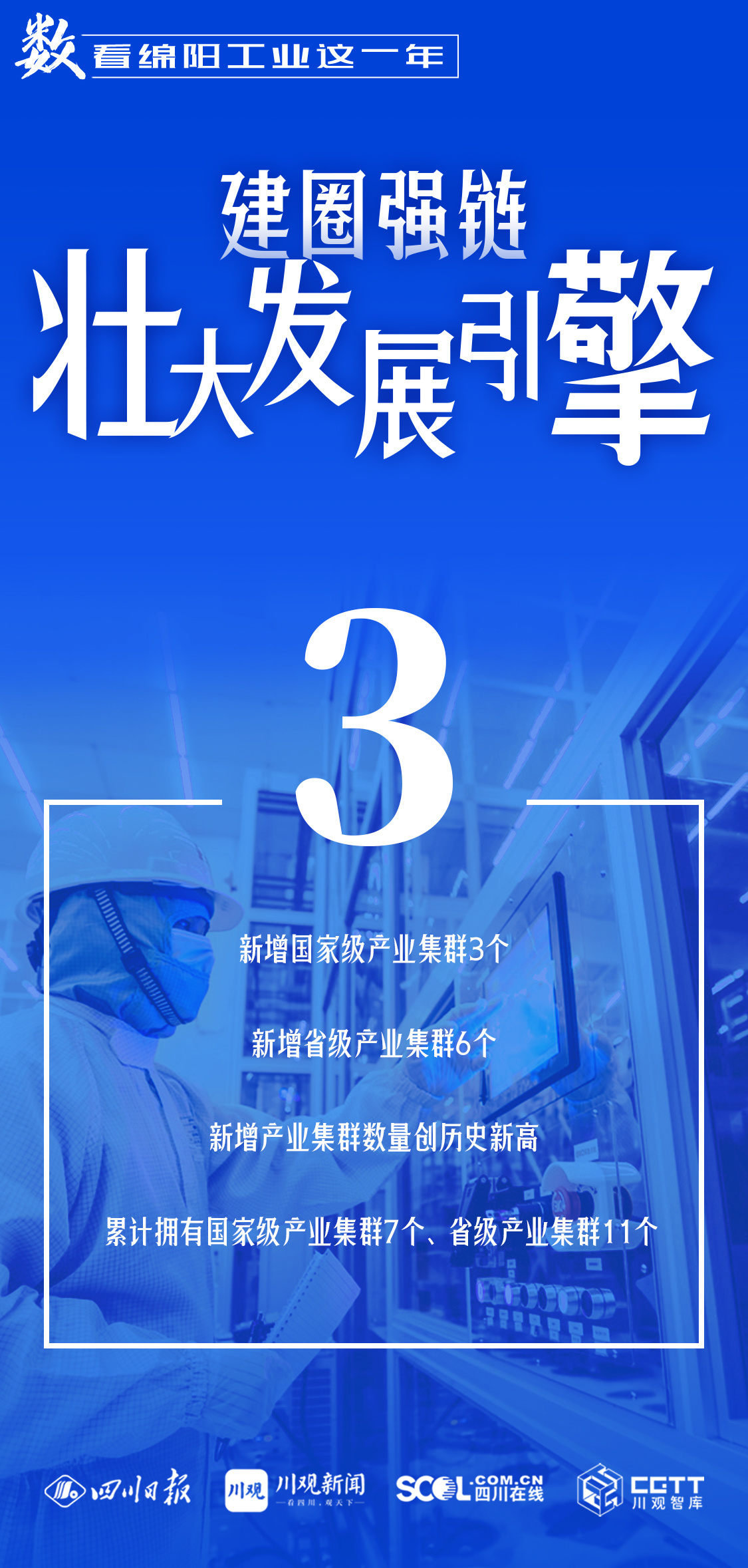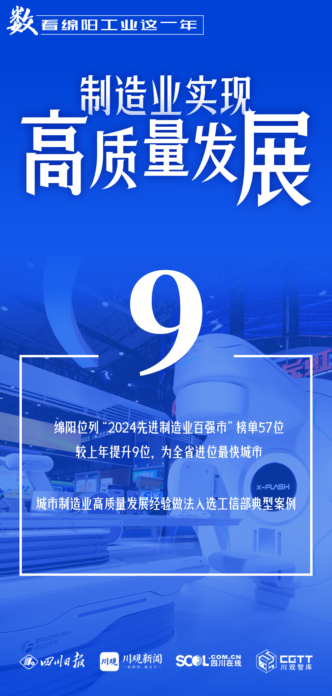 2024年,綿陽新增國家級產(chǎn)業(yè)集群3個,新增省級產(chǎn)業(yè)集群6個,新增產(chǎn)業(yè)集群數(shù)量創(chuàng)歷史新高;綿陽入選全國市級地方政府制造業(yè)數(shù)字化轉(zhuǎn)型典型案例城市、為西部唯一;綿陽位列“2024先進(jìn)制造業(yè)百強(qiáng)市”榜單59位、較上年提升9位,全省進(jìn)位最快……
