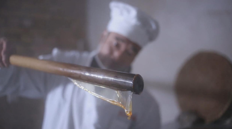 炒糖時(shí),一開始先用棍攪,攪不動(dòng)以后用木鏟鏟,直到炒出一些大凝泡以后,這糖就算炒好了。等糖冷卻到一定程度,就可以制作糖瓜了。制作糖瓜時(shí),要防止糖在低溫下變硬。所以要直接在鍋上利用熱氣扯糖,借著水汽的滋潤(rùn),鍋前的張克明父子將熬好的糖拿出一塊,掛在木鉤上,開始用手拉扯,焦黃的麥芽糖隨著水蒸氣不斷的熏蒸,在連續(xù)拉扯幾十次后變得松軟而潔白。