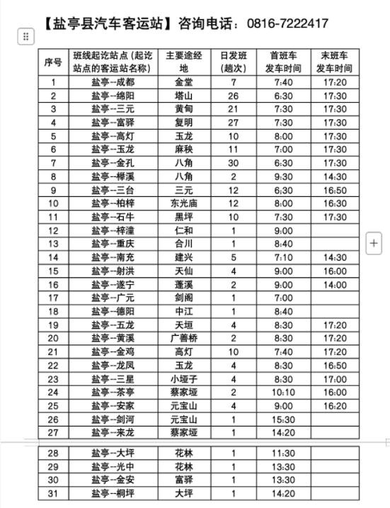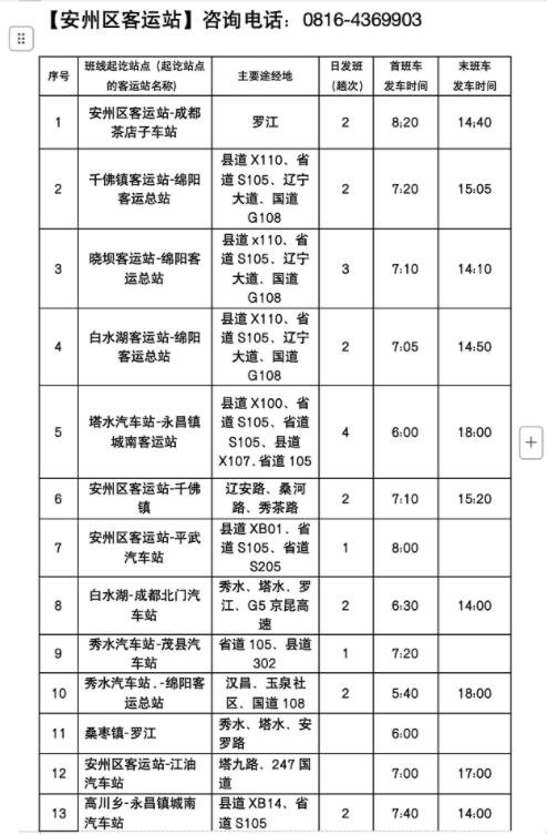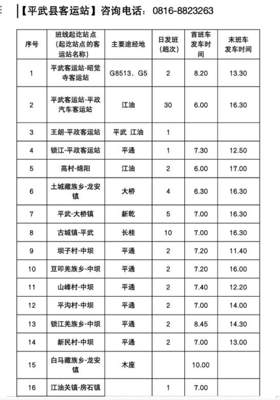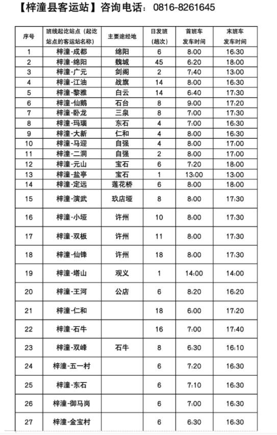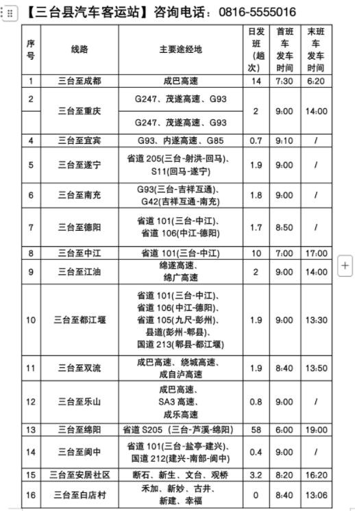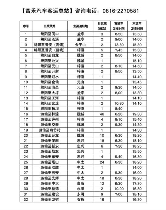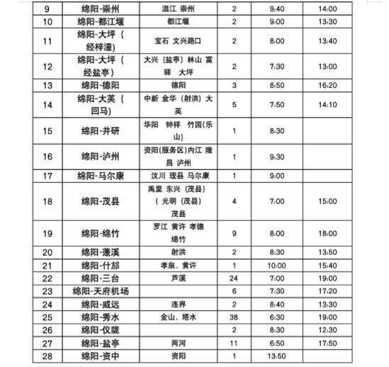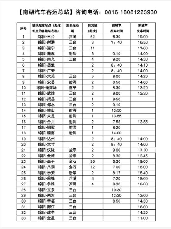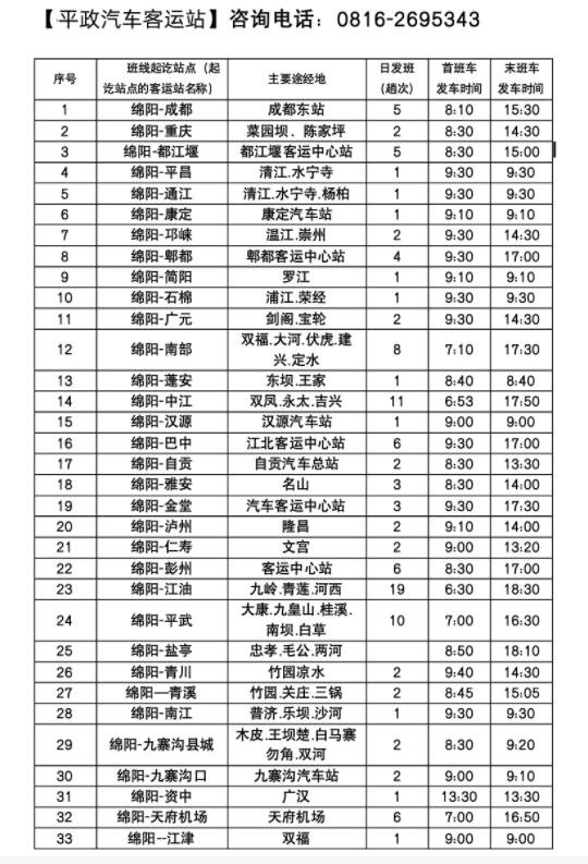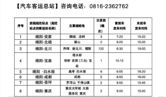 綿陽新聞網(wǎng)訊 目前,綿陽各大汽車站已迎來出行客流高峰。為了大家平安便利出行,記者將全市各車站主要班次時刻表進行了匯總,建議有出行需求的旅客提前了解、規(guī)劃乘車時間、路線。