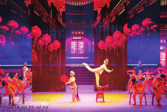 文脈跨越千年,現(xiàn)代藝術演繹出別樣綿州風情。在情景歌舞《吾愛吾家》中,吹落塵封千年的塵土,喚醒東漢說唱俑,講述吳家鎮(zhèn)的“前世今生”;燈光亮起,演員們身著川劇服裝,從歷史的光影中款款而來,演繹戲曲中的《川味綿長》。