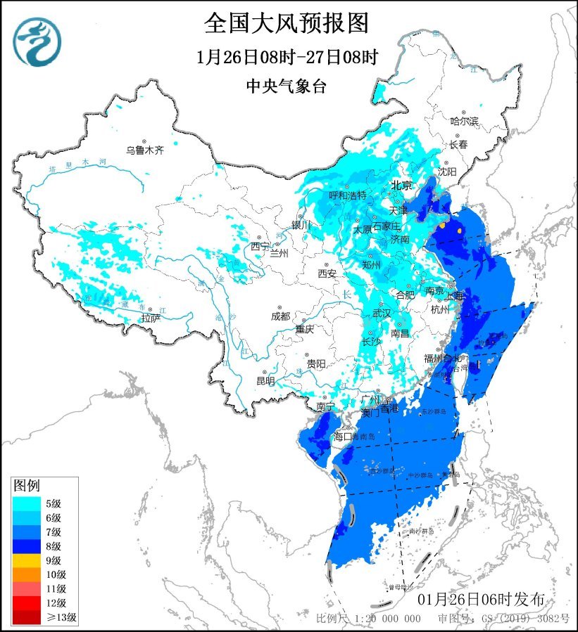 預(yù)計,1月26日08時至27日08時,西藏中西部、青海東部、內(nèi)蒙古中東部、陜西北部、山西、河北、遼寧西部和南部、北京、天津、山東、河南大部、湖北中東部、湖南東部、安徽中北部、江蘇大部、上海、浙江沿海、江西北部、廣西東部、廣東沿海等地部分地區(qū)將有5級左右偏北風、陣風7~9級;渤海、渤海海峽、黃海大部海域、東海大部海域、臺灣海峽、臺灣以東洋面、南海大部海域、北部灣將有7~8級、陣風9~10級的大風,其中黃海中部部分海域的風力可達9級、陣風10~11級。