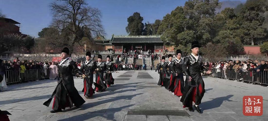 隨后,一眾演員拜謝“四恩”,拾階而下,來到報(bào)恩寺廣場中心位置。禮樂齊鳴,“明代”仕女翩翩起舞,一瞬間仿佛帶人穿越到了幾百年前的風(fēng)華大明。