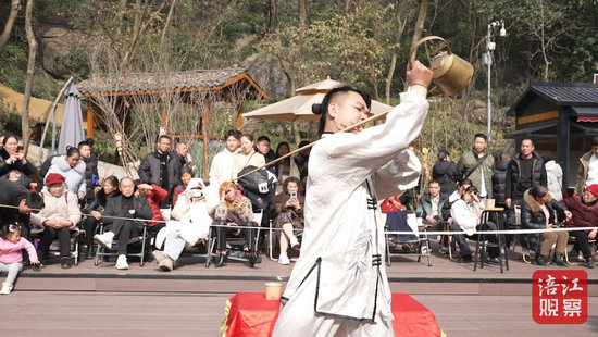 除了舞獅和變臉,長(zhǎng)嘴壺茶藝也成為了此次非遺活動(dòng)中的一大亮點(diǎn)。只見茶藝師手持長(zhǎng)嘴壺,精準(zhǔn)地控制水流,沖泡出一杯杯香醇的茶湯。這一技藝不僅展示了中國(guó)傳統(tǒng)茶文化的深厚底蘊(yùn),也讓游客們?cè)谄奋啵惺艿搅朔沁z文化的獨(dú)特韻味。