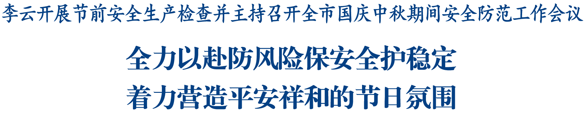 9月30日,市委副書(shū)記、市長(zhǎng)李云前往城區(qū)開(kāi)展節(jié)前安全生產(chǎn)檢查并主持召開(kāi)全市國(guó)慶中秋期間安全防范工作會(huì)議,強(qiáng)調(diào)要深入學(xué)習(xí)貫徹習(xí)近平總書(shū)記關(guān)于安全生產(chǎn)的重要論述,認(rèn)真落實(shí)省安委會(huì)2025年第四次全體會(huì)議暨全省安全生產(chǎn)、森林草原防滅火工作視頻會(huì)議精神,全力以赴防風(fēng)險(xiǎn)、保安全、護(hù)穩(wěn)定,著力營(yíng)造平安祥和的節(jié)日氛圍?! ?/p>