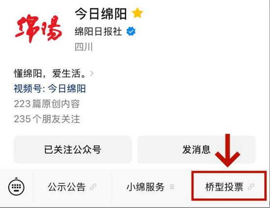 1.搜索“今日綿陽(yáng)”微信公眾號(hào),進(jìn)入公眾號(hào)的指定推文頁(yè)進(jìn)行投票。