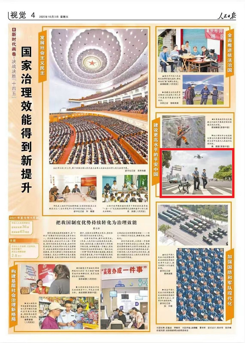 10月3日出版的《人民日報》刊發(fā)文章《國家治理效能得到新提升》,以圖片形式展現(xiàn)“十四五”時期我國社會主義民主法治更加健全,“高效辦成一件事”等改革舉措加速推進,平安中國建設邁向更高水平。其中,關注了四川綿陽利用警用機器狗與空中巡邏無人機進行巡邏防控,助力建設更高水平的平安中國。全文如下: