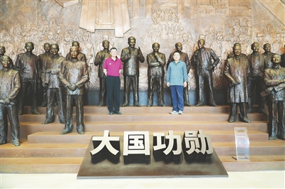 鄧稼先之子鄧志平(左)、于敏之子于辛(右)在父輩雕塑前合影